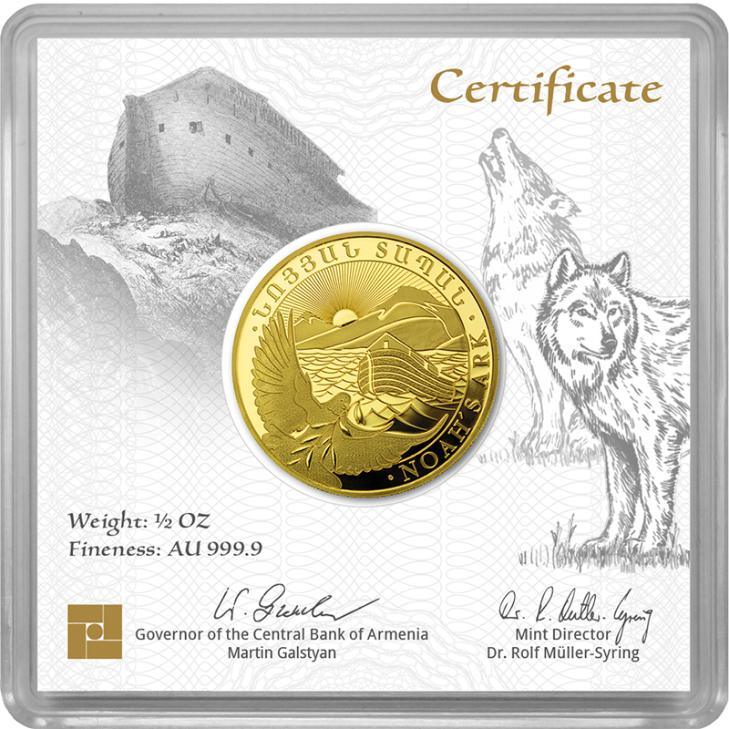 Kovanice od plemenitih metala sa motivom “Noina arka” 2026 izdaje Središnja banka Republike Armenije i koje služe kao zakonsko sredstvo plaćanja u Armeniji. Proizvodnja podliježe strogim zahtjevima Središnje banke: čistoću plemenitog metala, težinu i kvalitetu kovanja testira i jamči država. Zlatnik je izrađen od najčistijeg zlata (999,9/1000).